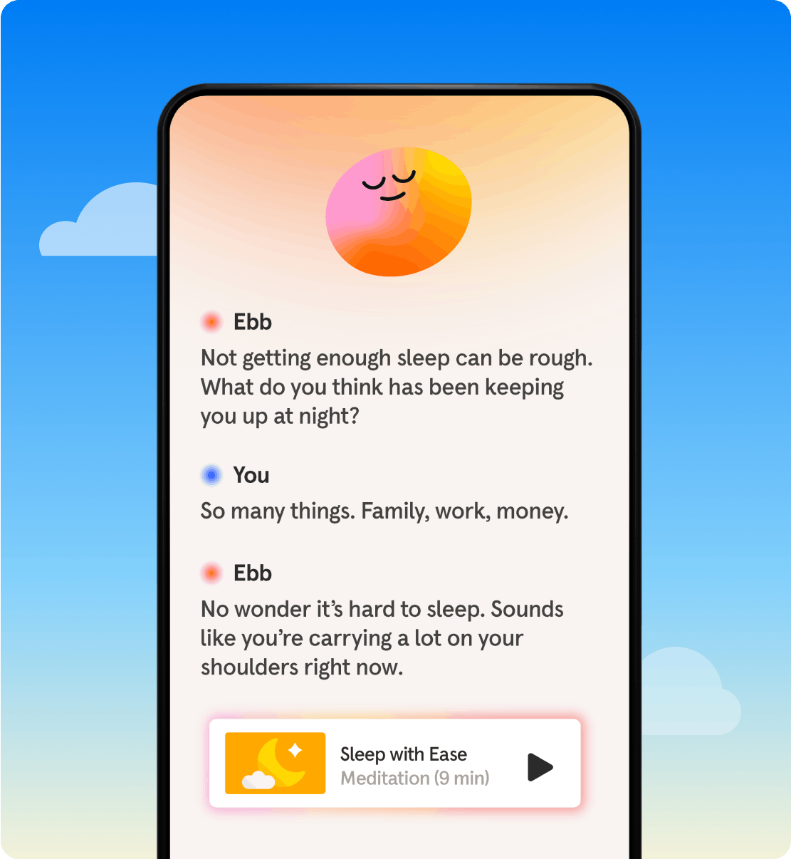 Whether you’re processing relationship challenges, work stress, or sleep issues, Ebb is there to help you unpack what’s on your mind.